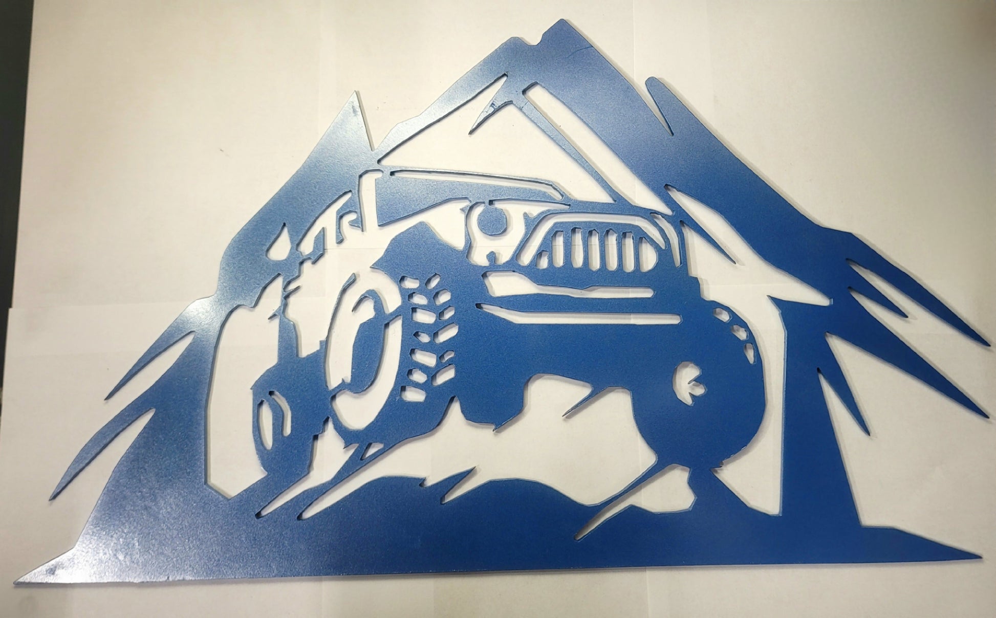 This Jeep with Mountains Wall Sign is CNC cut from 16 gauge mild steel. Overall dimensions are approximately 14.5" H x 24" W. Standard Colors are Black or White.**