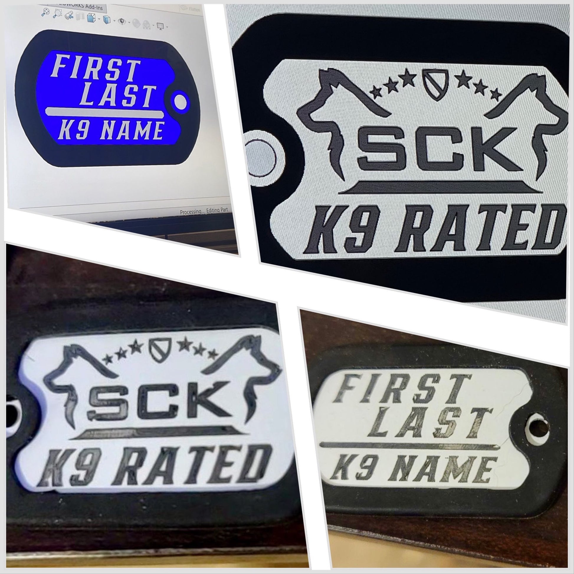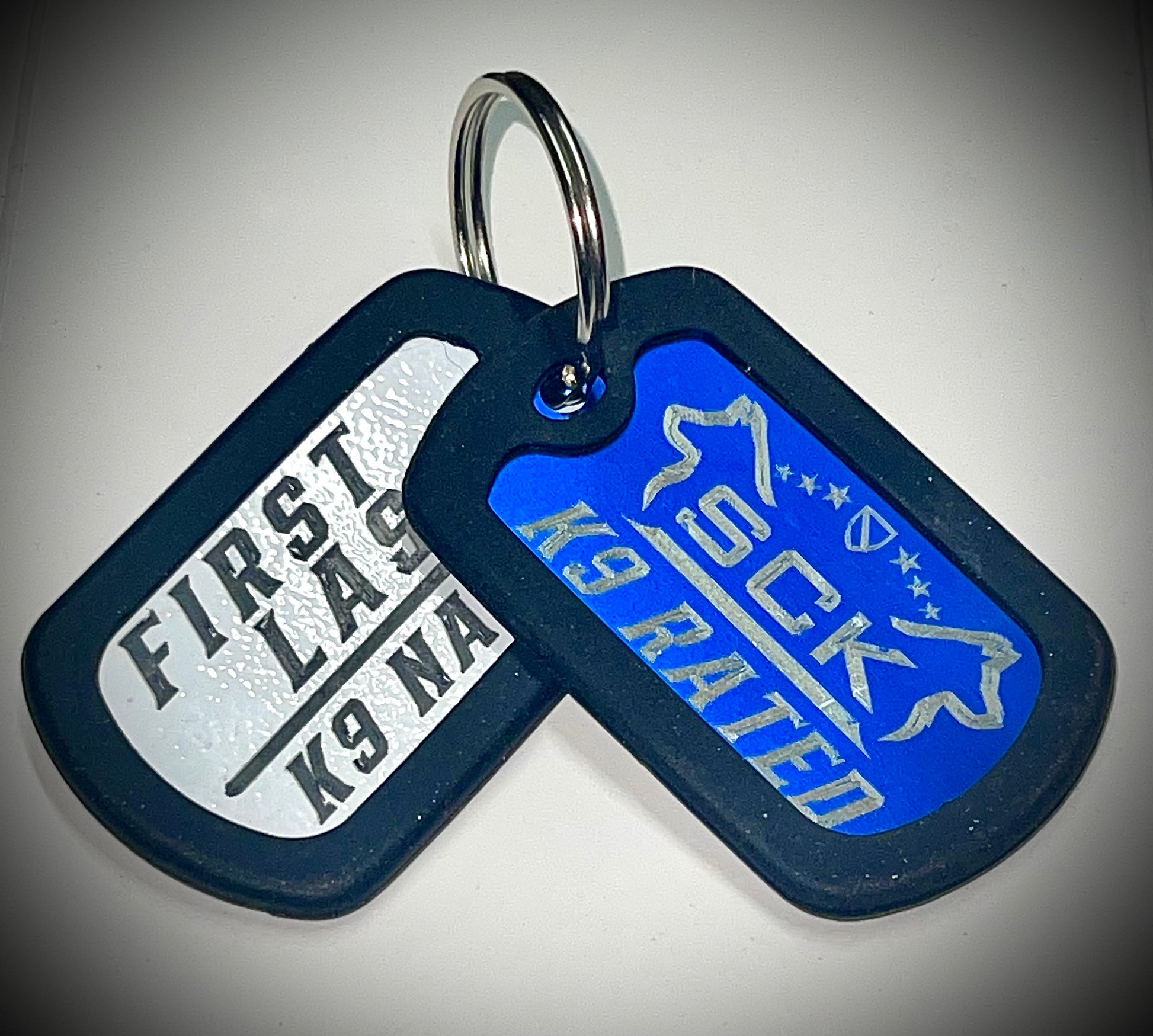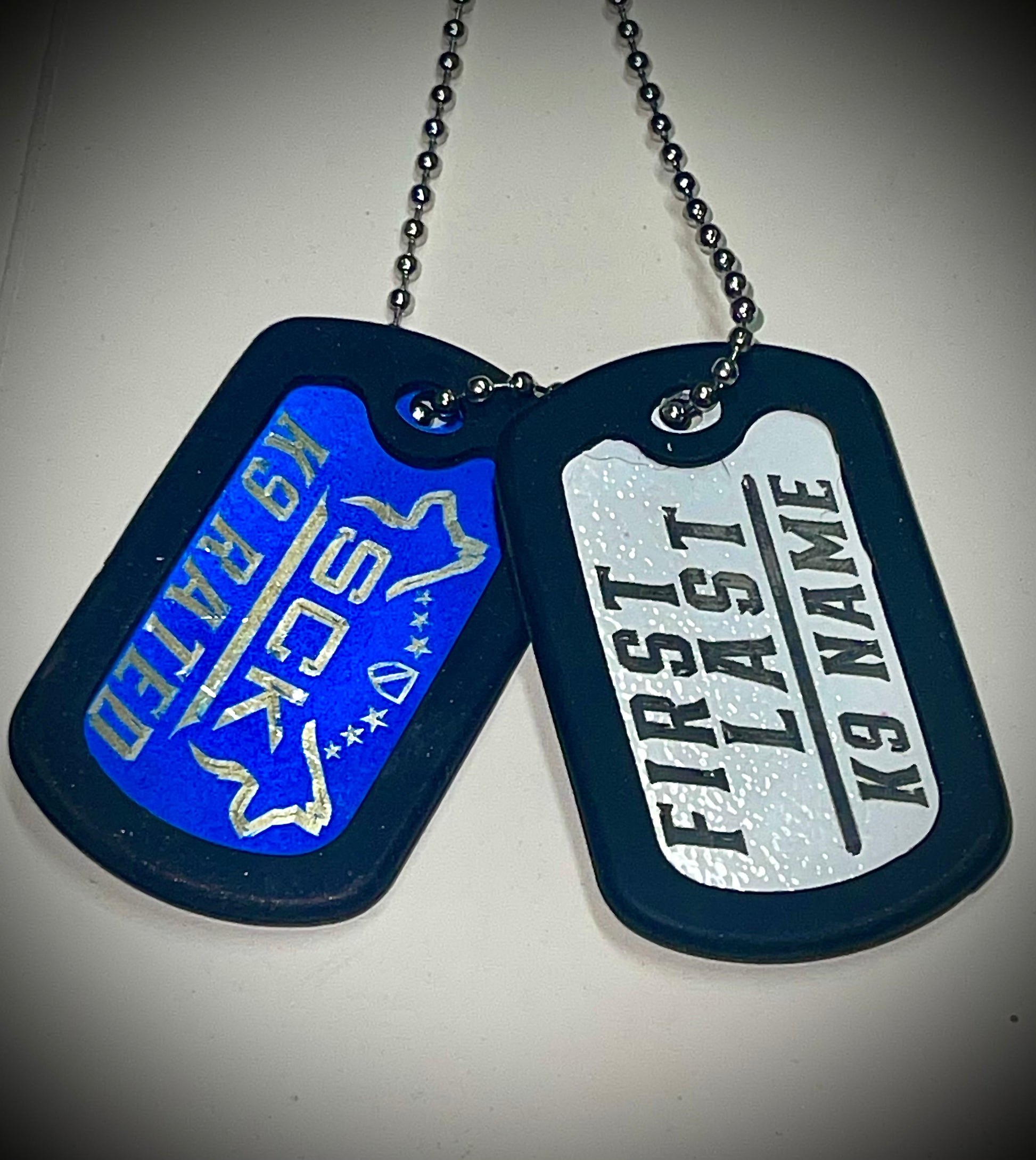 A set of 2 - 50mm X 30mm powder coated Dog Tags with custom laser engraving.