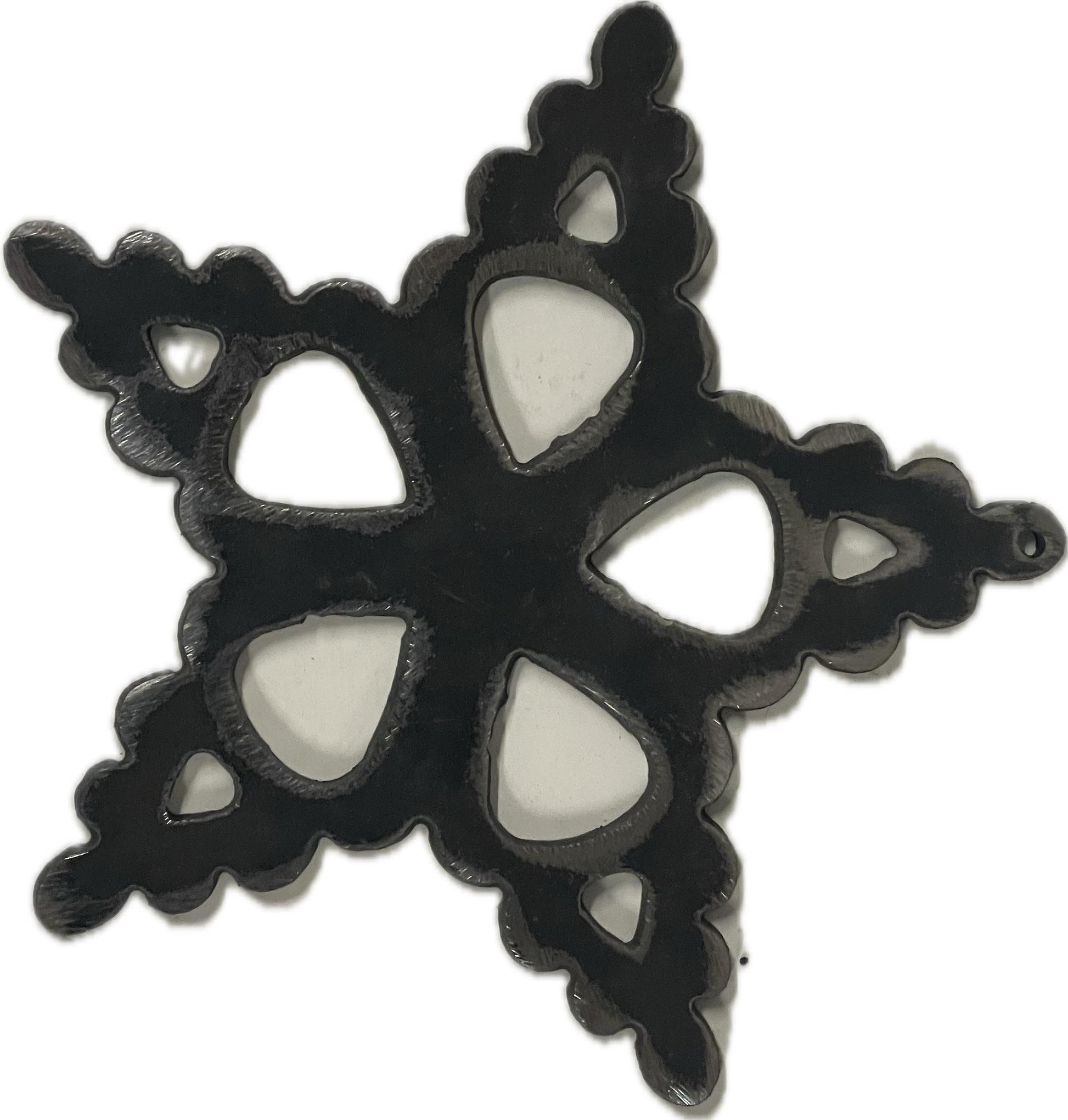 Perfect for hanging on a tree or mantel. This Star Ornament is CNC cut from 16 gauge mild steel. Overall dimensions are approximately 4.5" H x 4.5" W. Standard Colors are Black or White.**