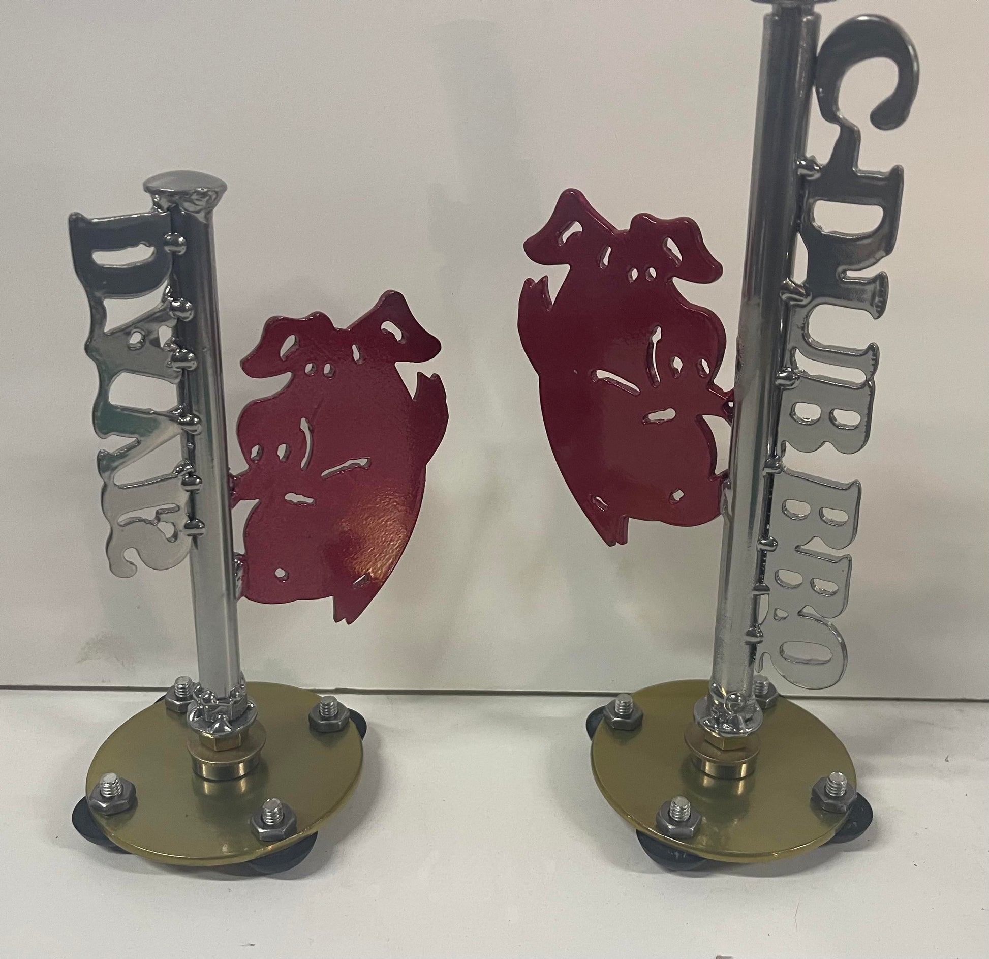 Our customizable Stripper Pig is CNC cut from 3/16 inch mild steel. Overall dimensions are approximately 9.5" H x 5" W. Standard powder coat colors: Gold Base, Chrome Pole/Name, and Red Pig. *Additional colors available upon request*